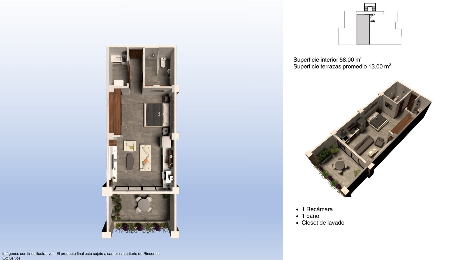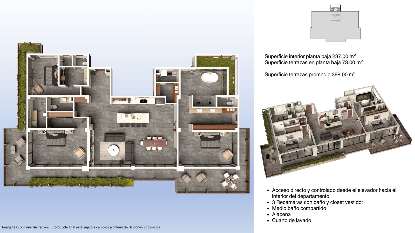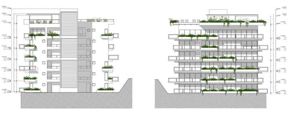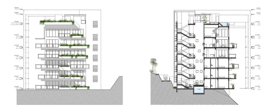 Torre de 332 m2 de desplante, de niveles que varían entre 3 y 6 niveles de acuerdo a su ubicación en el terreno, acoplándose a vistas y a la topografía. Las terrazas de los departamento varían en su forma y superficie generando espacios de diferentes cualidades espaciales.