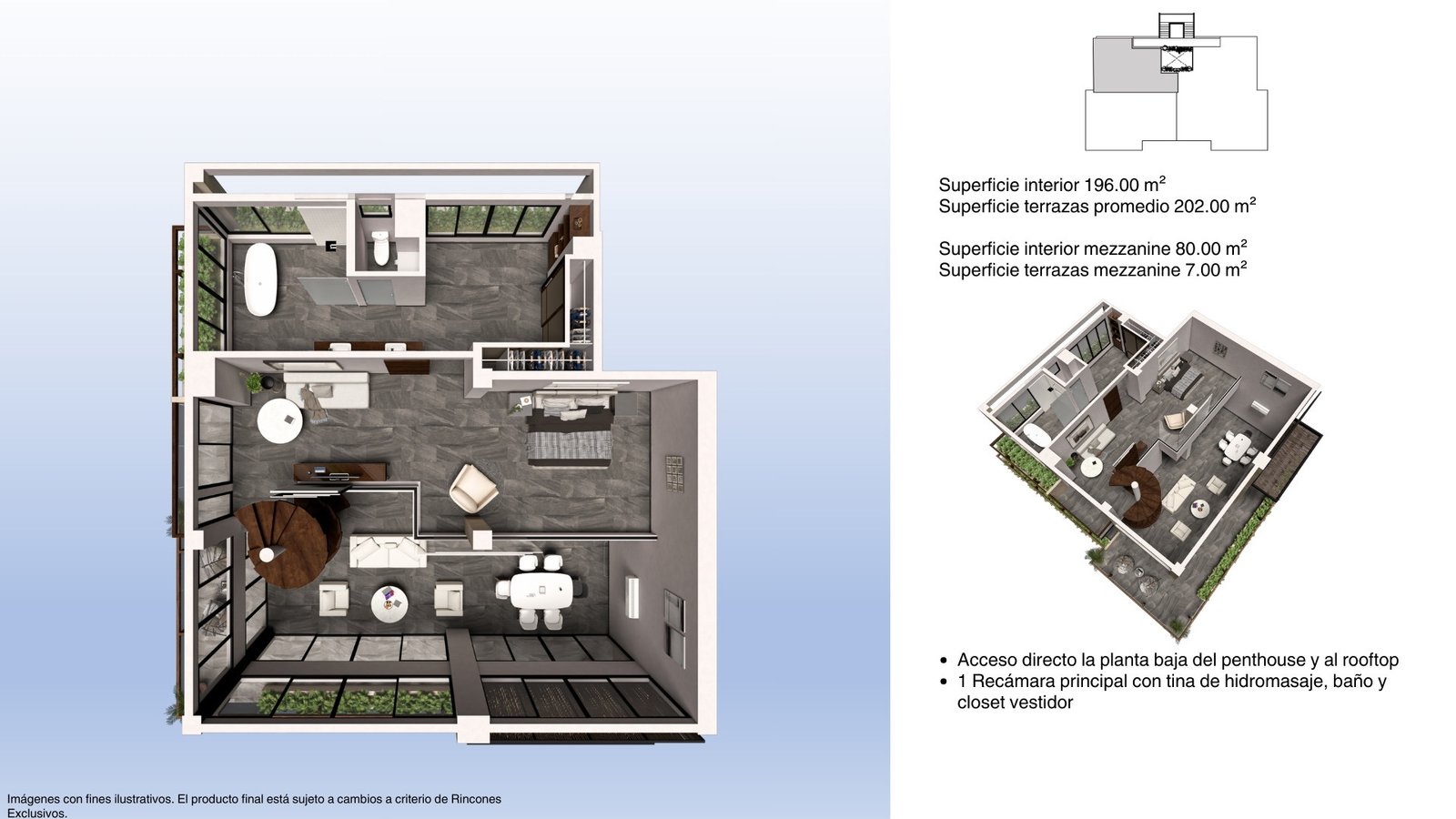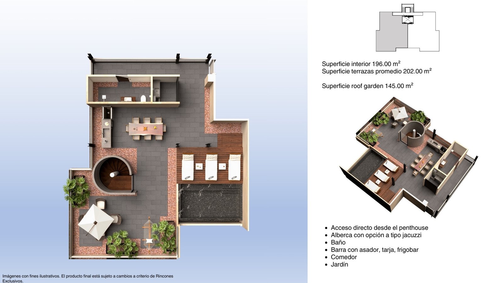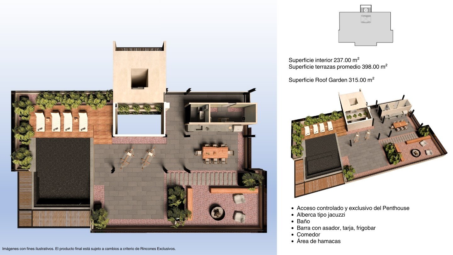 En la azotea del edificio se ubica el roof garden exclusivo para el penthouse con jacuzzi, área de hamacas y sala al aire libre con fire pit.